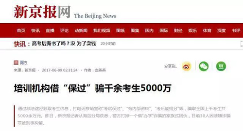 小铁铁根据新闻了解到:这些机构通过非法途径获取考生信息,打电话推销宣称“考试保过”、“有内部资料”、“考后能提分”等,骗取全国上千考生共5000余万元。
