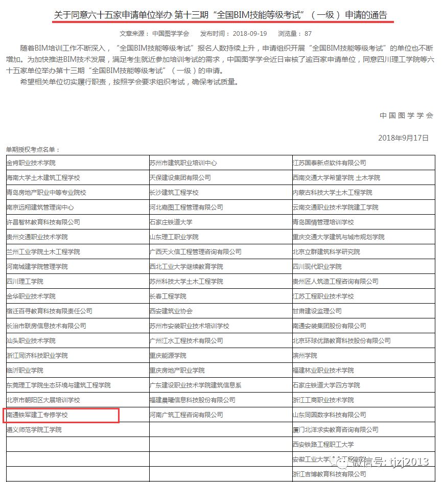 9月17日,中国图学学会正式授权铁军建工专修学校为全国BIM技能等级考试考点,并批准铁军举办第十三期全国BIM技能等级考试(一级)。这是中国图学学会、全国BIM技能等级考评工作指导委员会对铁军环境、硬件、师资力量、课程结构等各方面给予的肯定。